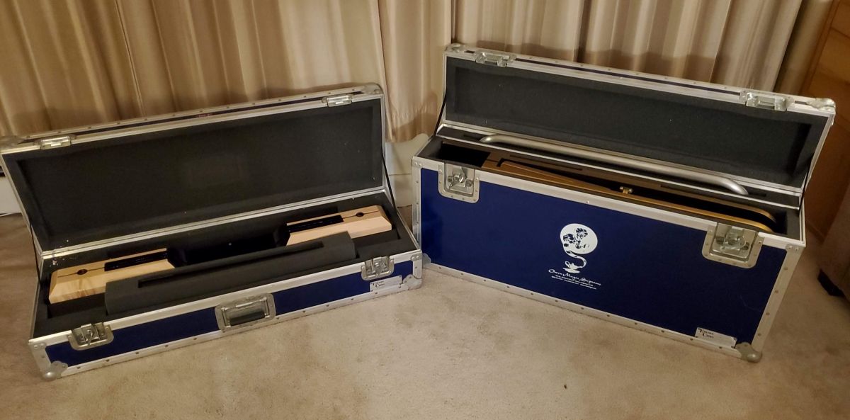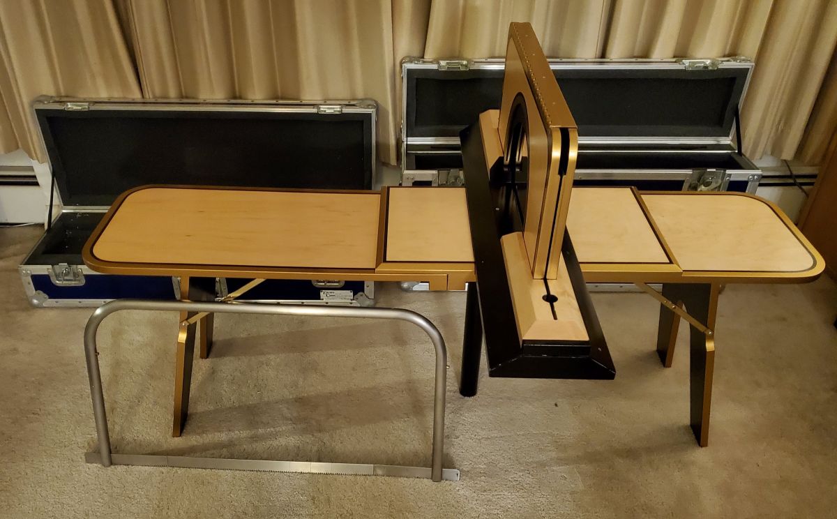 Excellent condition gently used. Includes original Folding table, Stock, Bow, Instructions. All items fit in two ATA custom fit foam padded cases approximate dimensions & weight: Case #1-Table & Bow 41″L x 19”H x 9”W Weight = 68 lbs., Case #2-Stock & Middle table leg 42″L x 14”H x 9”W Weight = 59 lbs. Pickup or meetup in N.E. U.S. (Near NYC Metro area). Contact Steve at: (845) 206-4748